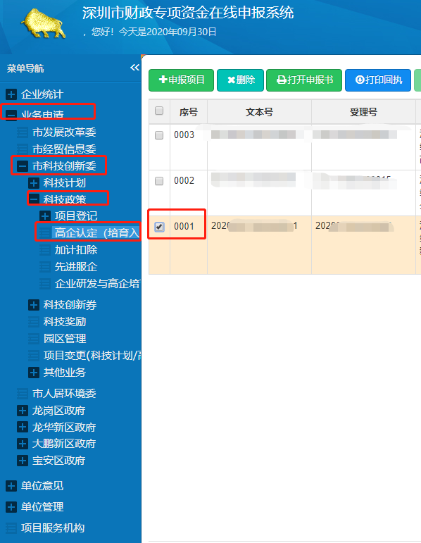 2、登陸后,依次選擇“業(yè)務(wù)申請(qǐng)”、“市科技創(chuàng)新委”、“科技政策”、“高企認(rèn)定(培育入庫)”選項(xiàng)。